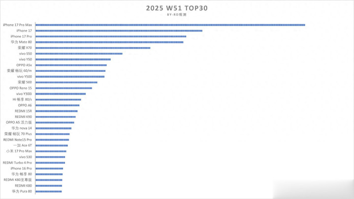 根据行业人士“RD观测”提供的最新W51周单品销量Top30数据来看,这一周iPhone 17系列又霸占前三了。且大家注意看那个数据图,iPhone 17 Pro Max可以用远远领先来形容了,这一款机型的销量是国产多款机型之和。所以本周就不谈iPhone 17系列了,只给大家罗列国产机型的排名。信息显示国产排名第一的是华为Mate 80,排名第二的是荣耀X70,排名第三的是vivo S50。后面的机型依次为:vivo Y50、OPPO A5x、荣耀畅60、vivo Y500、荣耀500、OPPO Reno15、vivo Y300i、Hi 畅享80、OPPO A6、REDMI 15R、REDMI K90、OPPO A5活力版、华为nova 14、荣耀畅玩70 Plus、REDMI Note15 Pro、一加Ace6T、小米17 Pro Max、vivo S30、REDMI Turbo4 Pro、iPhone 16 Pro、华为畅享80、REDMI K80至尊版、REDMI K80、华为Pura 80。