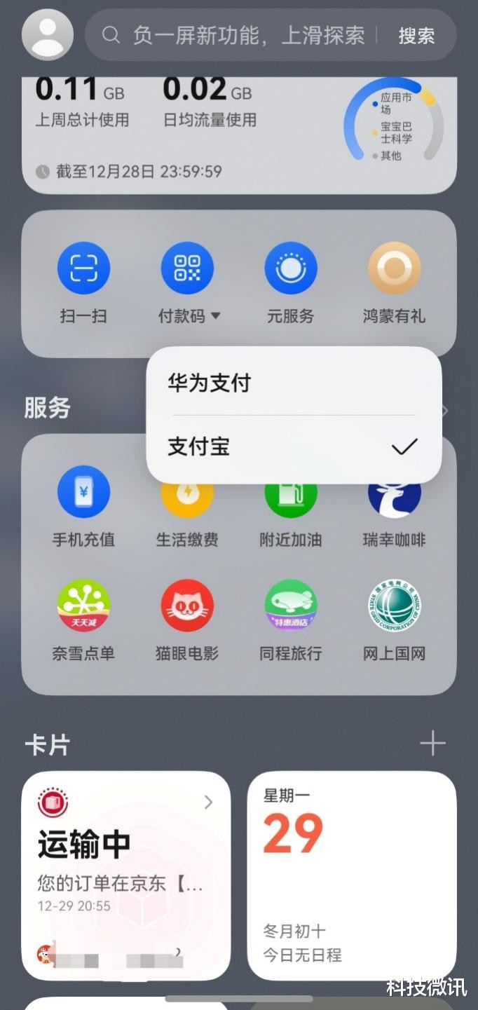 这时候鸿蒙版支付宝和淘宝就派上用场了。现在的鸿蒙版支付宝,不仅启动速度快,桌面服务卡片的创新特性也特别好用。把扫一扫和付款码直接加到负一屏,扫码支付一步到位。